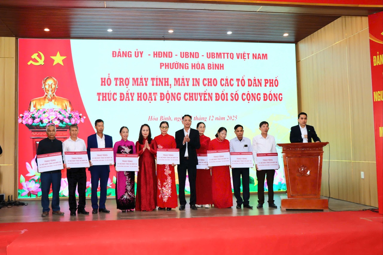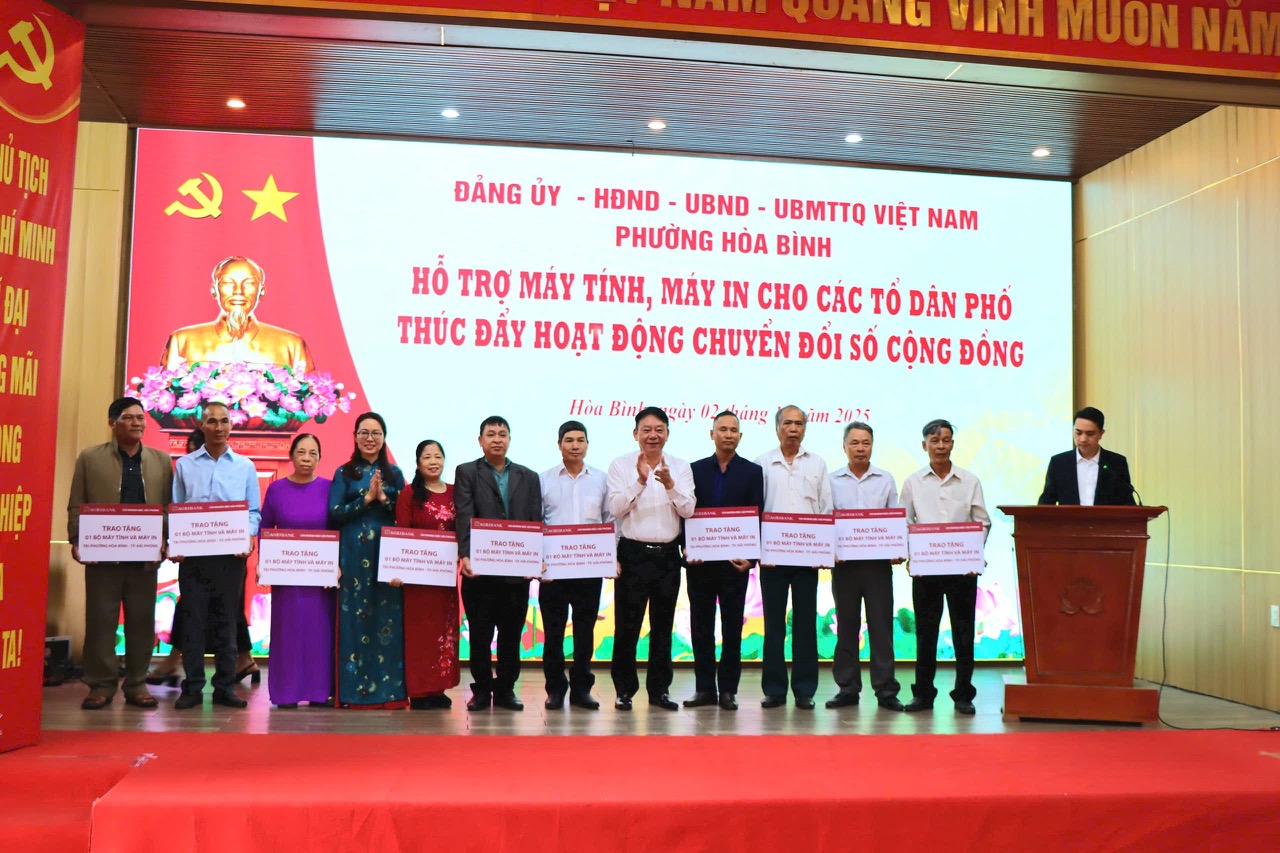Tại hội nghị, Ngân hàng Nông nghiệp và Phát triển nông thôn (Agribank) chi nhánh Bắc Hải Phòng và chi nhánh Thủy Nguyên đã trao tặng 20 máy vi tính và máy in cho các chi bộ tổ dân phố trực thuộc Đảng ủy phường Hòa Bình.