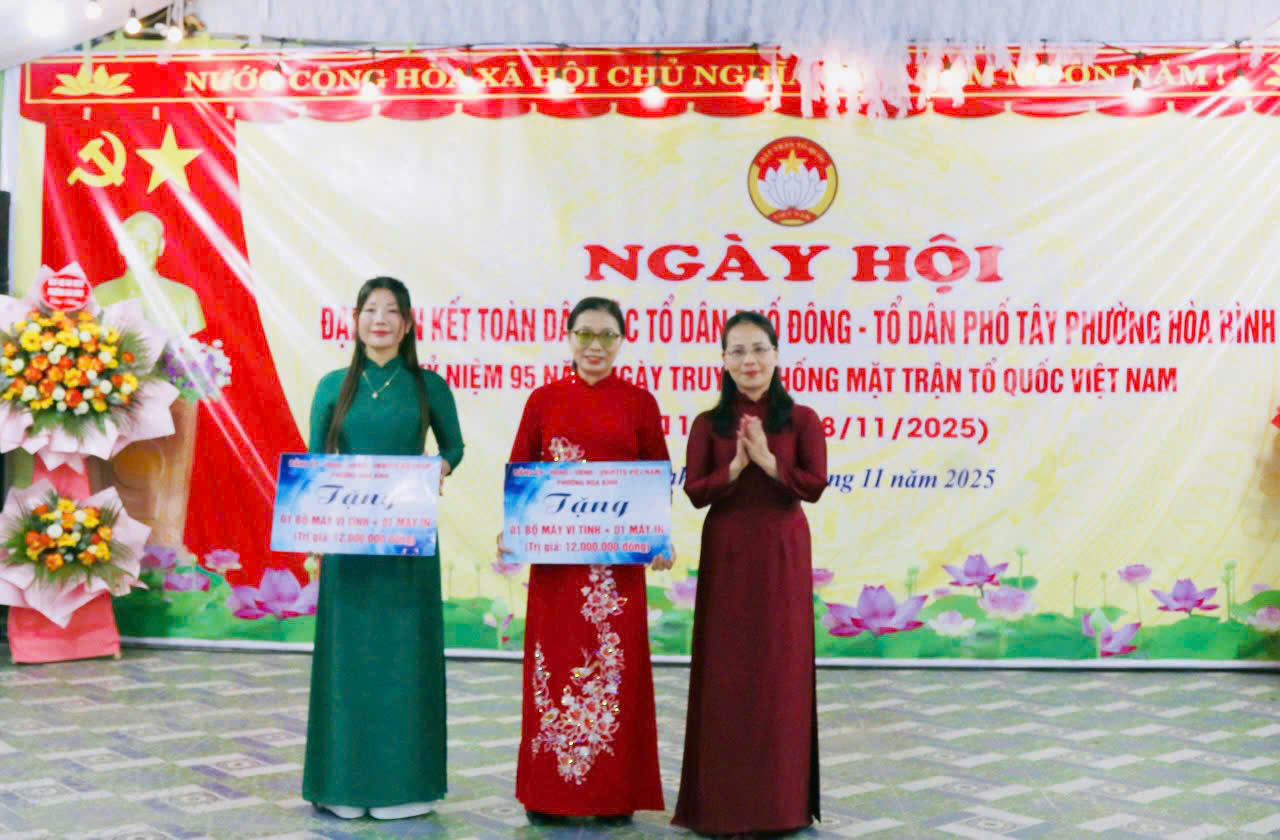 Cũng trong dịp này, đồng chí Bùi Thị Ngọc – Bí thư Đảng ủy, Chủ tịch HĐND phường – đã trao tặng cho tổ dân phố Đông và tổ dân phố Tây mỗi tổ một bộ máy vi tính và máy in, đồng thời trao quà cho các hộ có hoàn cảnh khó khăn của hai tổ dân phố.