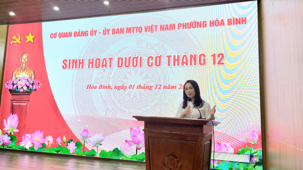 Trong buổi sinh hoạt, Đồng chí Bùi Thị Ngọc Bí thư Đảng ủy phường đã thông tin nhanh tình hình nhiệm vụ tháng 11, triển khai các công tác trọng tâm tháng 12, đặc biệt là những nhiệm vụ gắn với cao điểm cuối năm.