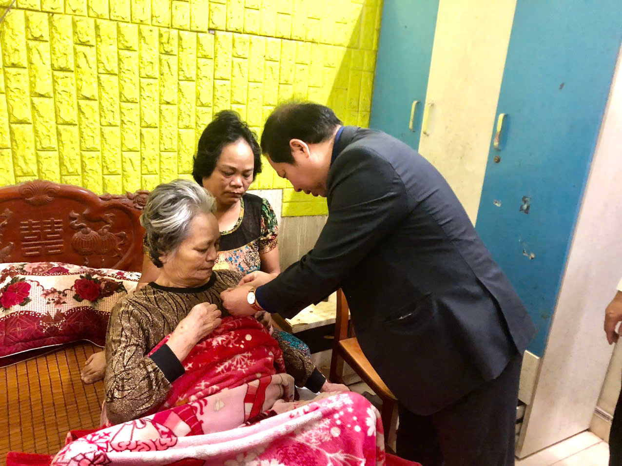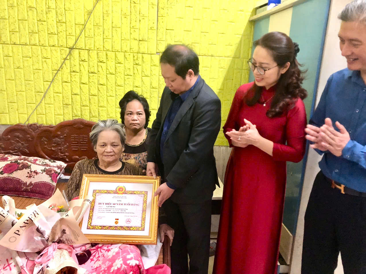 Đồng chí Vũ Hồng Hiên, Ủy viên Ban Thường vụ Thành ủy, Chủ nhiệm Ủy ban Kiểm tra Thành ủy, phụ trách Đảng bộ phường Hoà Bình, đã đến nhà và trao Huy hiệu Đảng cho đồng chí Lại Thị Mơ .