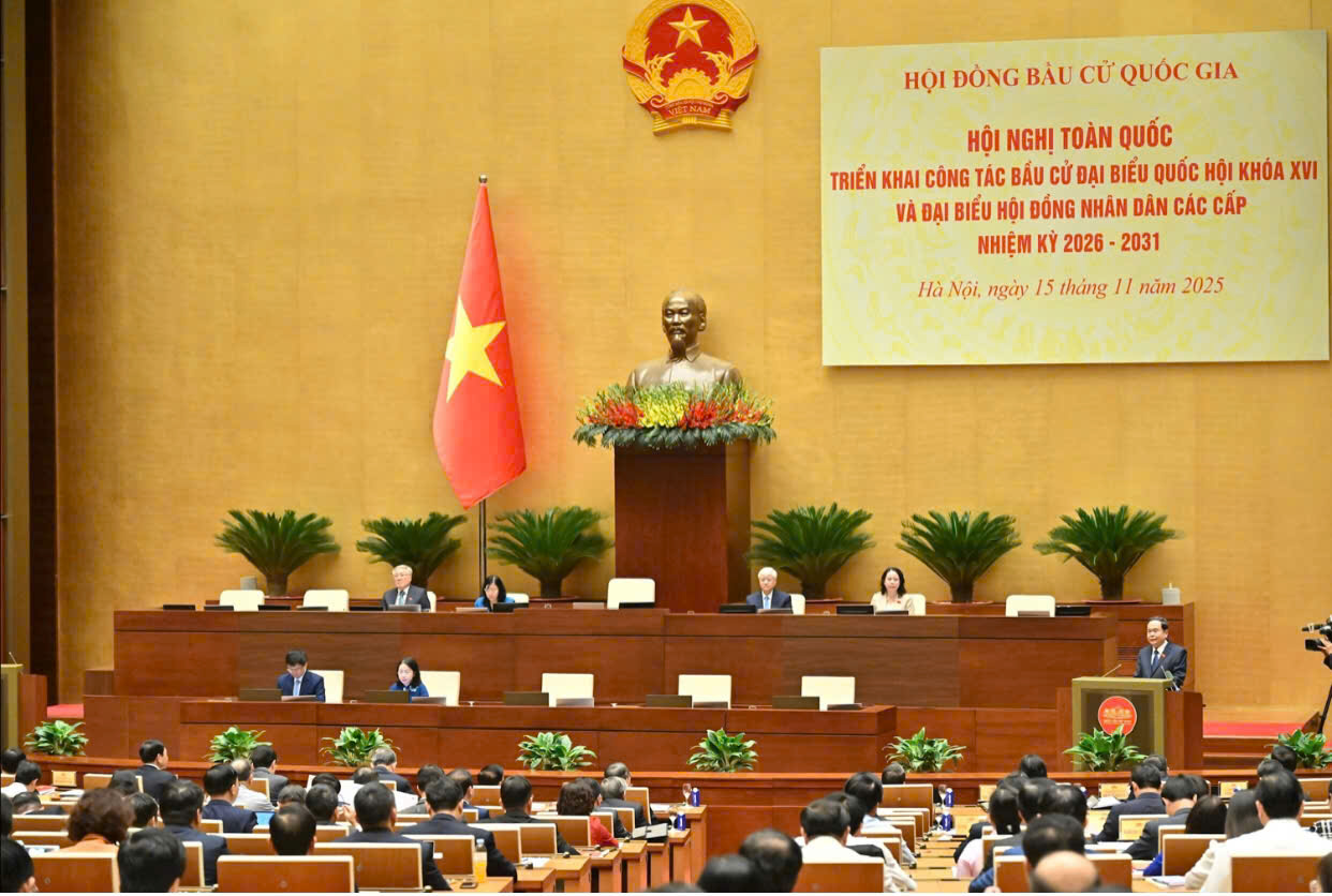 Sáng nay 15/11/2025, tại Phòng họp Diên Hồng (Nhà Quốc hội), Hội đồng Bầu cử quốc gia tổ chức Hội nghị toàn quốc quán triệt Chỉ thị của Bộ Chính trị, triển khai công tác bầu cử đại biểu Quốc hội khóa XVI và đại biểu Hội đồng nhân dân các cấp nhiệm kỳ 2026-2031. Hội nghị được tổ chức với hình thức trực tiếp tại phòng họp Diên Hồng và trực tuyến đến các điểm cầu cấp tỉnh và cấp xã tại 34 tỉnh, thành phố.