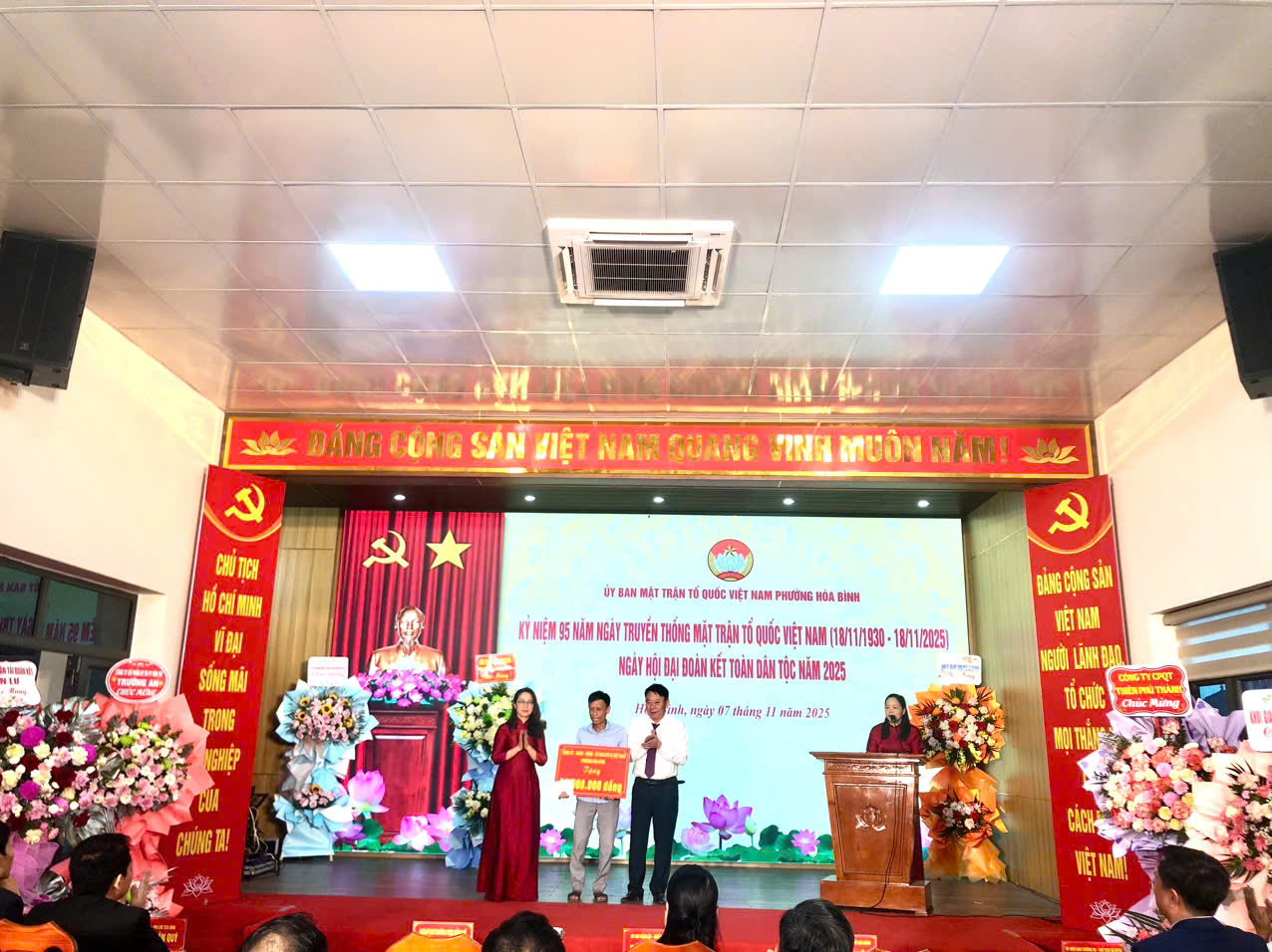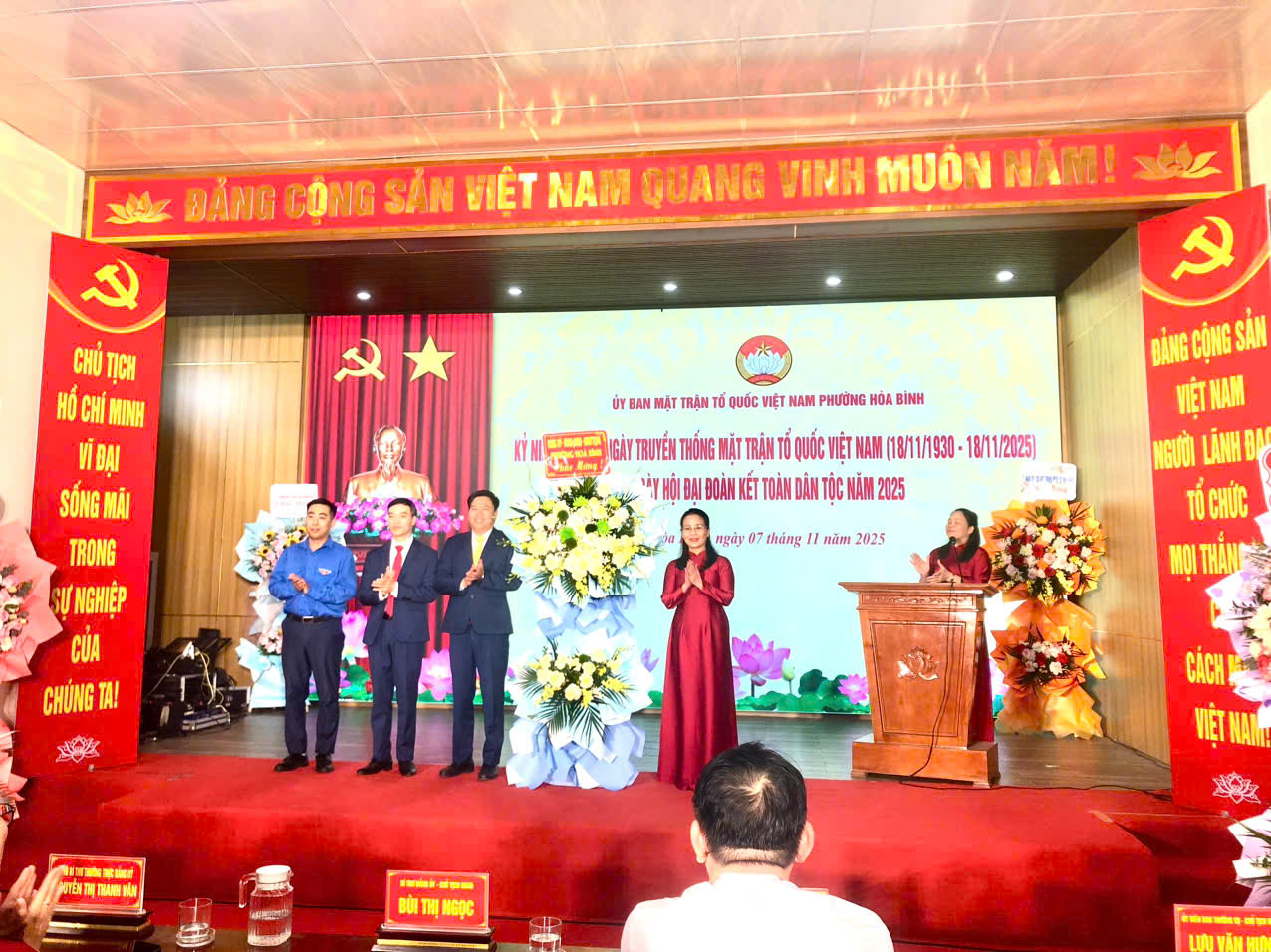 Nhân dịp này, đồng chí Bùi Thị Ngọc, Bí thư Đảng ủy, Chủ tịch HĐND phường, đã tặng hoa chúc mừng Ủy ban MTTQ Việt Nam phường Hòa Bình.