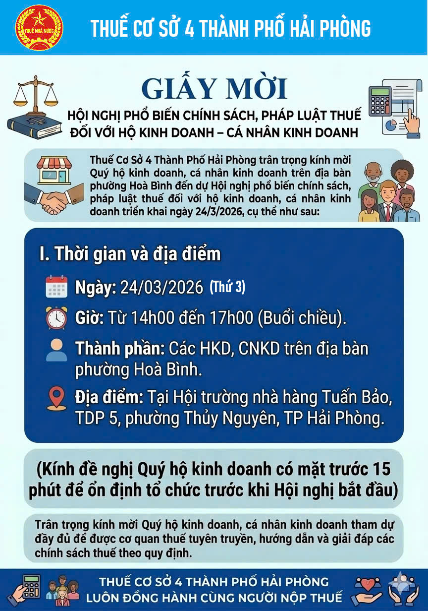 Thuế cơ sở 4 thành phố Hải Phòng mời dự hội nghị phổ biến chính sách, pháp luật Thuế đối với hộ kinh doanh -cá nhân kinh doanh.
