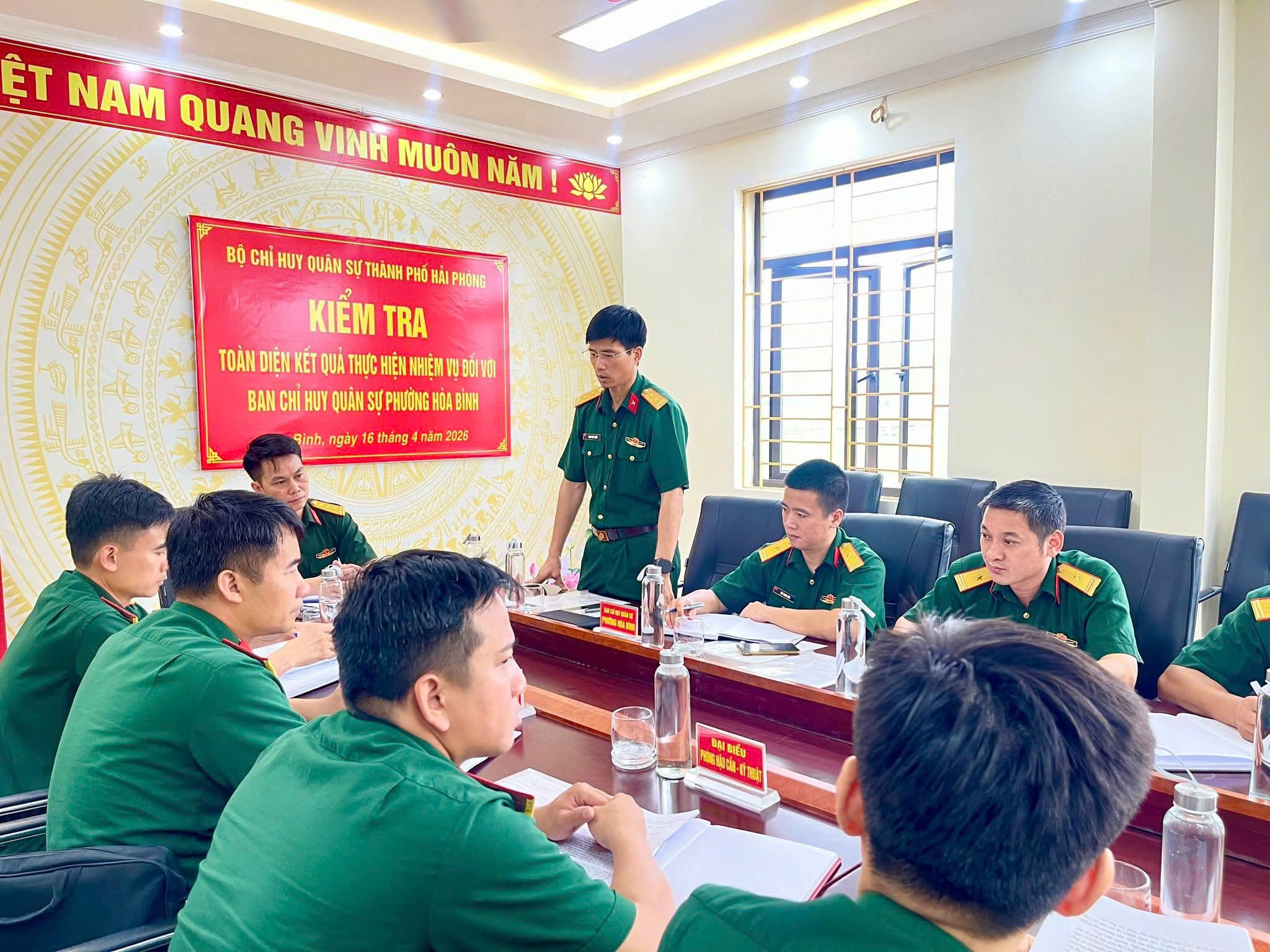 Chiều ngày 16/4/2026, Đoàn kiểm tra của Bộ Chỉ huy Quân sự thành phố Hải Phòng do Thượng tá Đoàn Văn Huân – Phó Chính ủy Ban Chỉ huy phòng thủ Khu vực 2 Kinh Môn làm trưởng đoàn đã tiến hành kiểm tra toàn diện kết quả thực hiện nhiệm vụ quốc phòng, quân sự địa phương tại Ban CHQS phường Hòa Bình. Tiếp và làm việc với đoàn có đồng chí Trung tá Phạm Văn Thuần – Chỉ huy Trưởng Ban CHQS cùng các đồng chí thuộc Ban CHQS phường Hòa Bình.