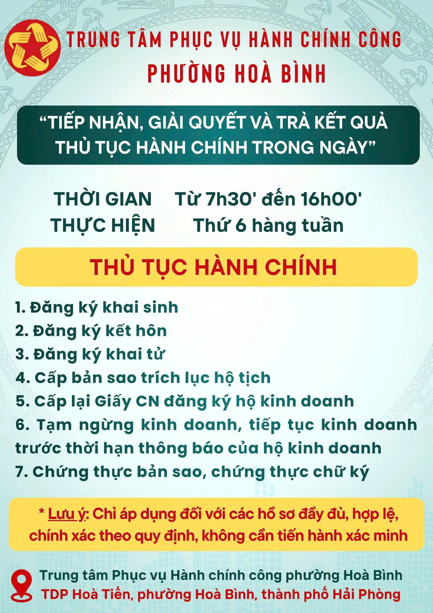 UBND phường Hoà Bình đề nghị các cá nhân, tổ chức khi có nhu cầu giải quyết thủ tục hành chính chủ động chuẩn bị đầy đủ hồ sơ và đến Trung tâm Phục vụ hành chính công để được hướng dẫn, giải quyết kịp thời.