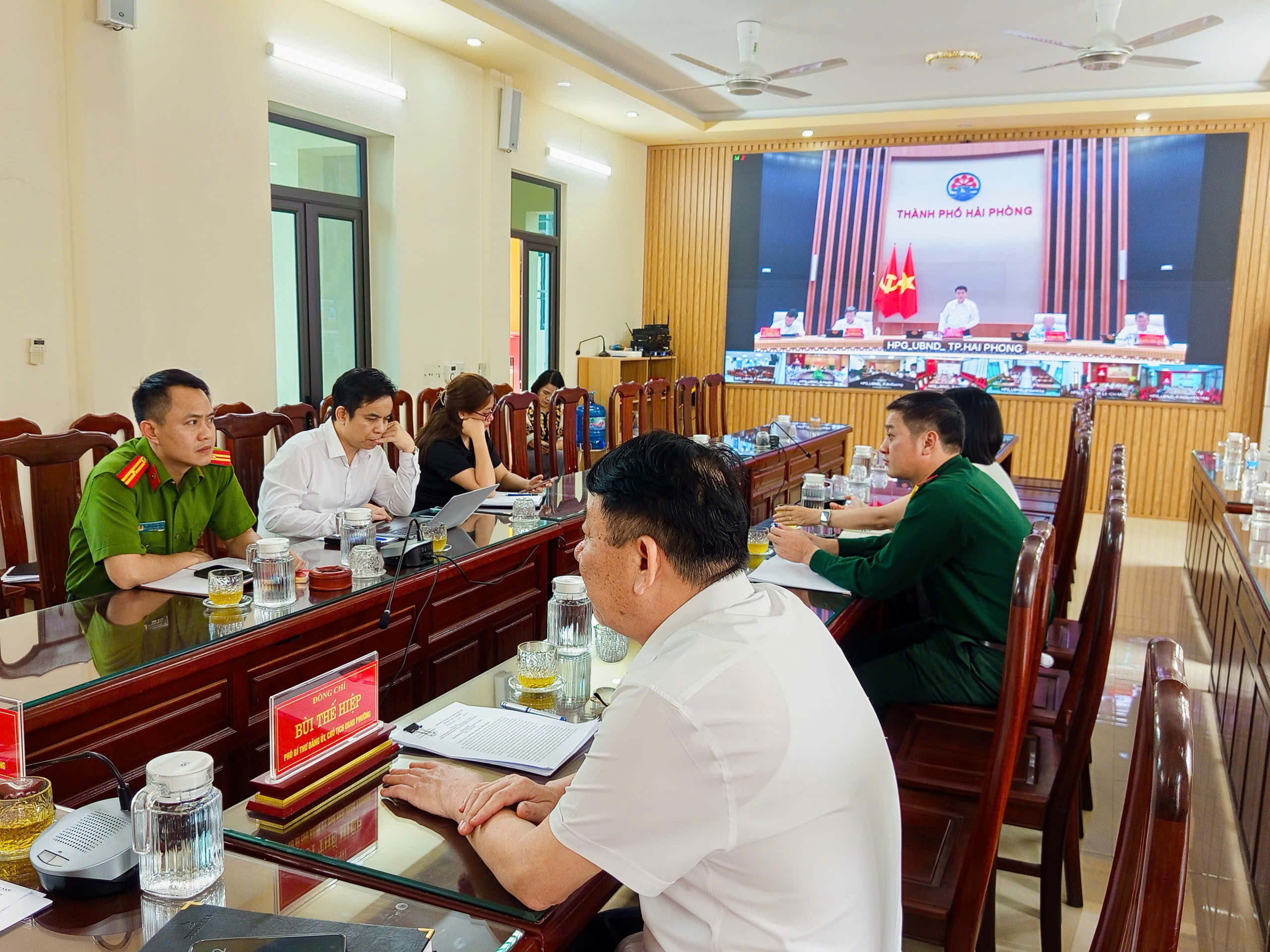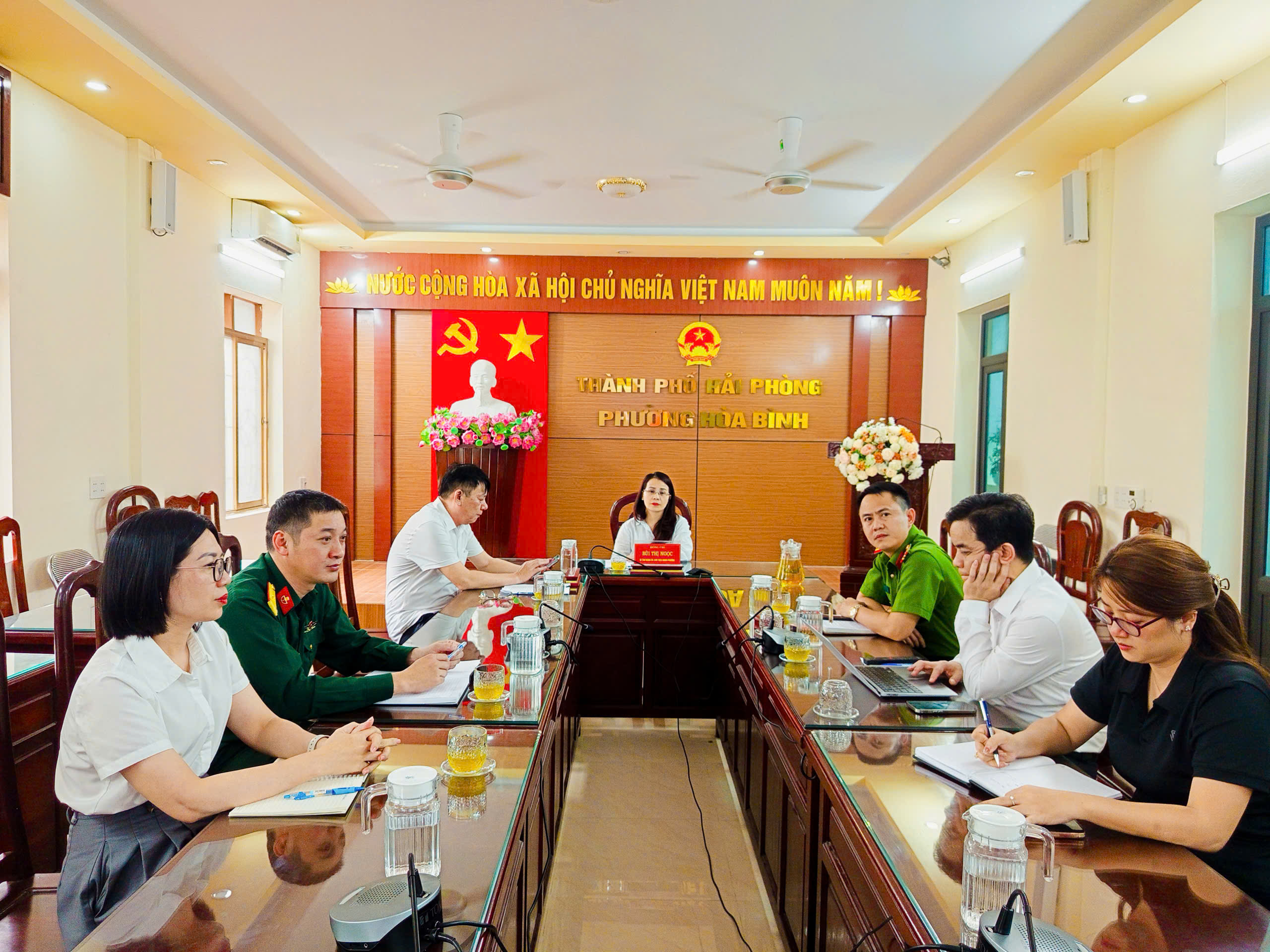 Dự phiên họp tại điểm cầu phường Hòa Bình có đồng chí Bùi Thị Ngọc - Bí thư Đảng uỷ, Chủ tịch HĐND phường; đồng chí Bùi Thế Hiệp - Chủ tịch UBND phường cùng các đồng chí lãnh đạo các phòng, ban, đơn vị liên quan.